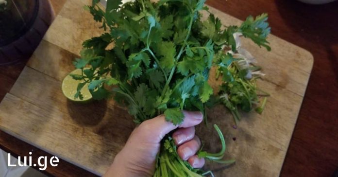 1. პირველ რიგში, თქვენ უნდა დაჭერით ქინძის ფოთლები დიდ ზომებად.