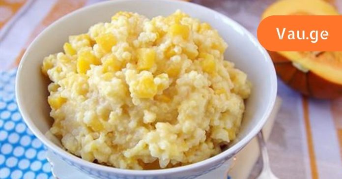 4. გახეხეთ გოგრა მსხვილ სახეხზე. დაუმატეთ ფაფას და მოხარშეთ პიურემდე.