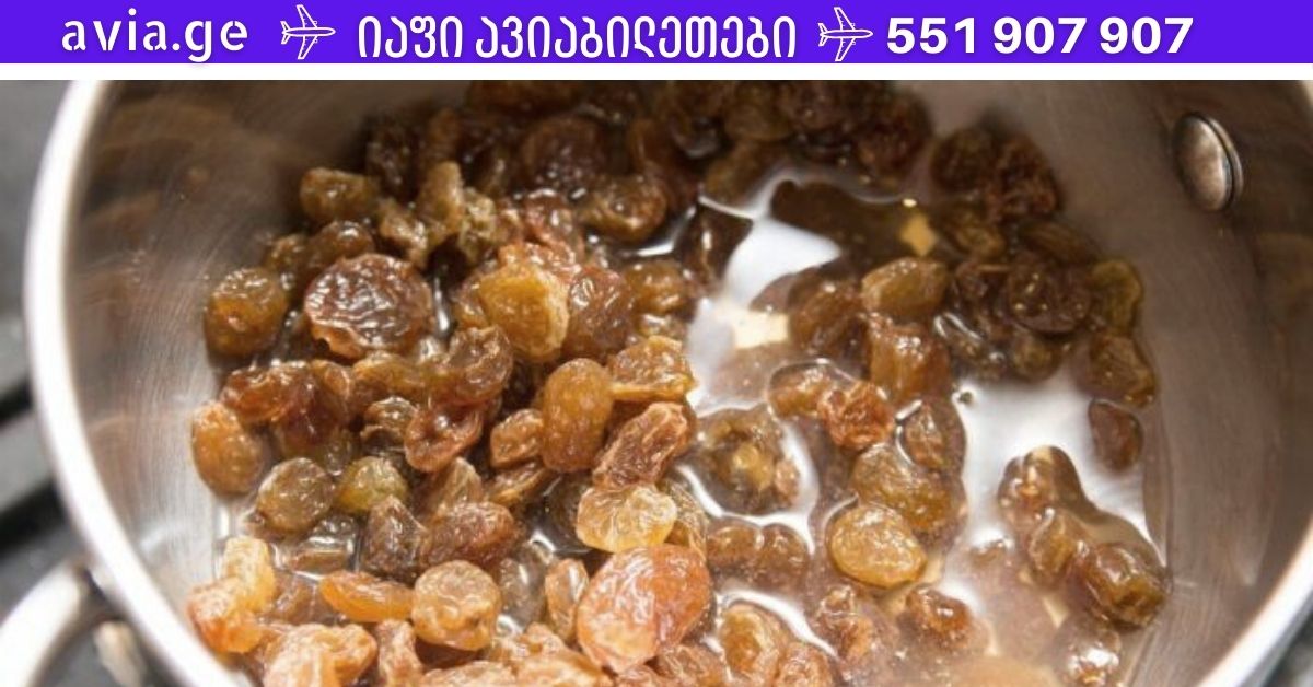აიღეთ ქვაბი, დაასხით 3 ჭიქა წყალი და დაამატეთ 1 ჭიქა შავი ქიშმიში. მოხარშეთ ქიშმიში 2 წუთის განმავლობაში და გააჩერეთ ის 24 საათი.