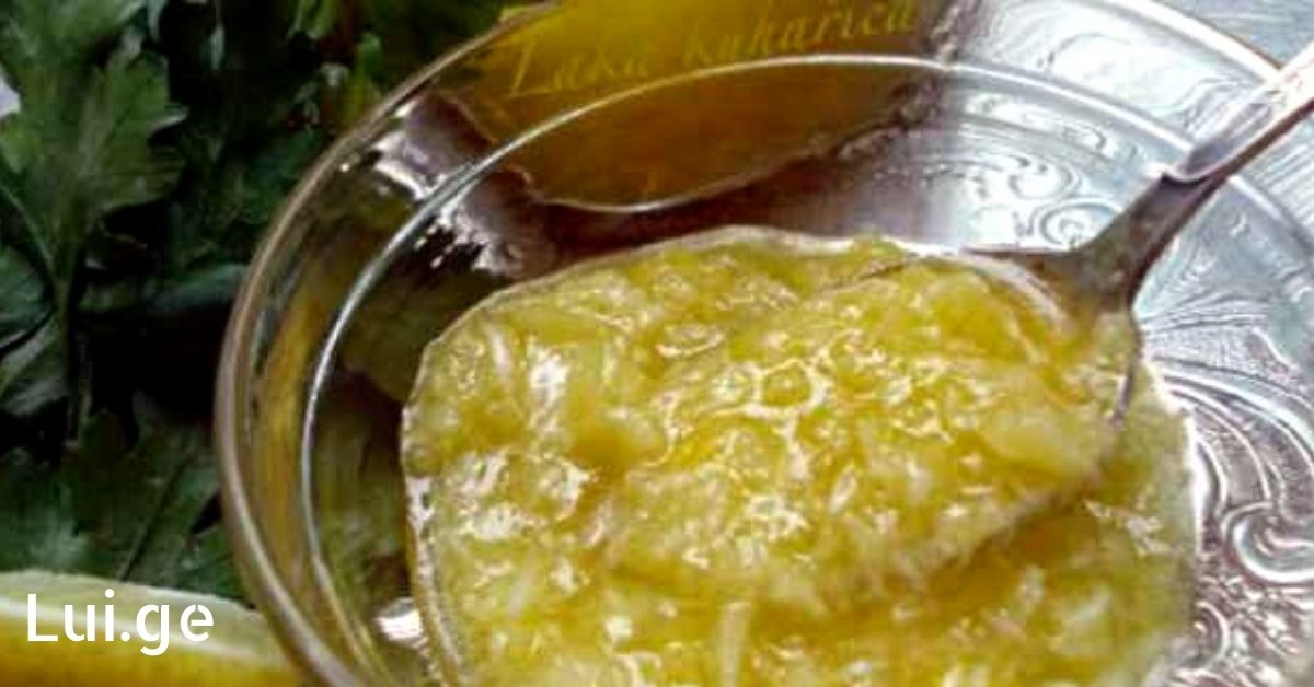 - ლიმონი კარგად გარეცხეთ, დაჭერით ნაჭრებად და აურიეთ ბლენდერში.