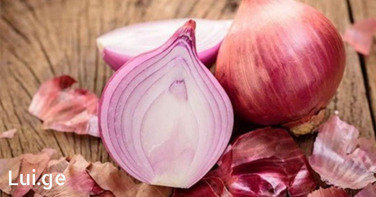 - აიღეთ 1 წითელი ხახვი და გაჭერით შუაზე, რომ წვენი გამოიღოს.