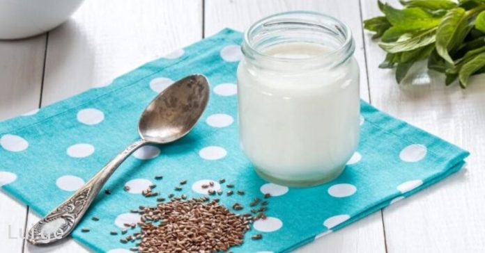 შეურიეთ 1 სუფრის კოვზი დაფქული სელის 1/4 ჭიქა კეფირი.